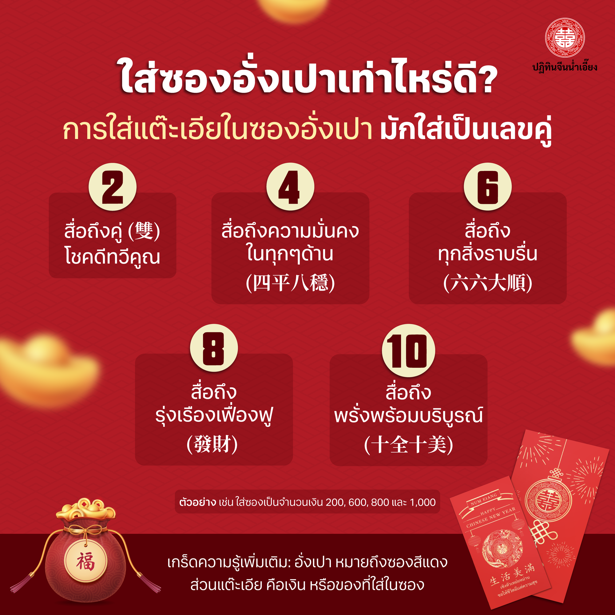 เกร็ดความรู้เพิ่มเติม: อั่งเปา หมายถึงซองสีแดงส่วนแต๊ะเอีย คือเงิน หรือของที่ใส่ในซอง