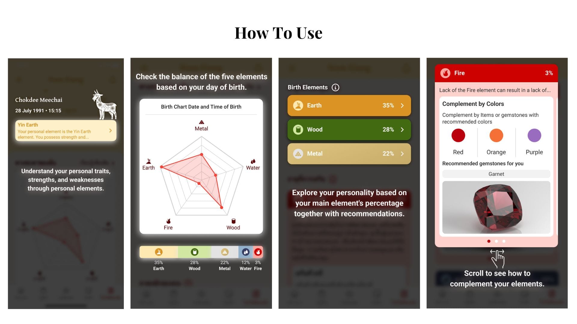 อยากรู้ต้องไปดูตรงไหน? เมื่อผู้ใช้งานได้กรอกข้อมูลของตนเองอย่างครบถ้วน เลื่อนไปที่หน้า “โปรไฟล์” (Profile) บนแอป แล้วเข้าไปที่ “ธาตุประจำตัวของคุณ” ทุกคนก็จะได้เห็นผลวิเคราะห์ปรากฎขึ้น ความสนุกที่แอปฯ น่ำเอี๊ยงเพิ่มเข้ามายังไม่จบ ทุกคนสามารถแชร์ผลวิเคราะห์ผ่านทาง Facebook หรือ Instagram ได้ด้วย มากกว่าการรู้จักตัวตนของตนเองมากขึ้น ผลวิเคราะห์นี้ยังทำให้ผู้ใช้งาน นำไปวิเคราะห์คนรอบข้างอย่างเช่น คนในครอบครัวมีธาตุประจำตัวคือธาตุใด มีความเข้ากันได้มากแค่ไหน ส่งเสริมกันได้อย่างไร