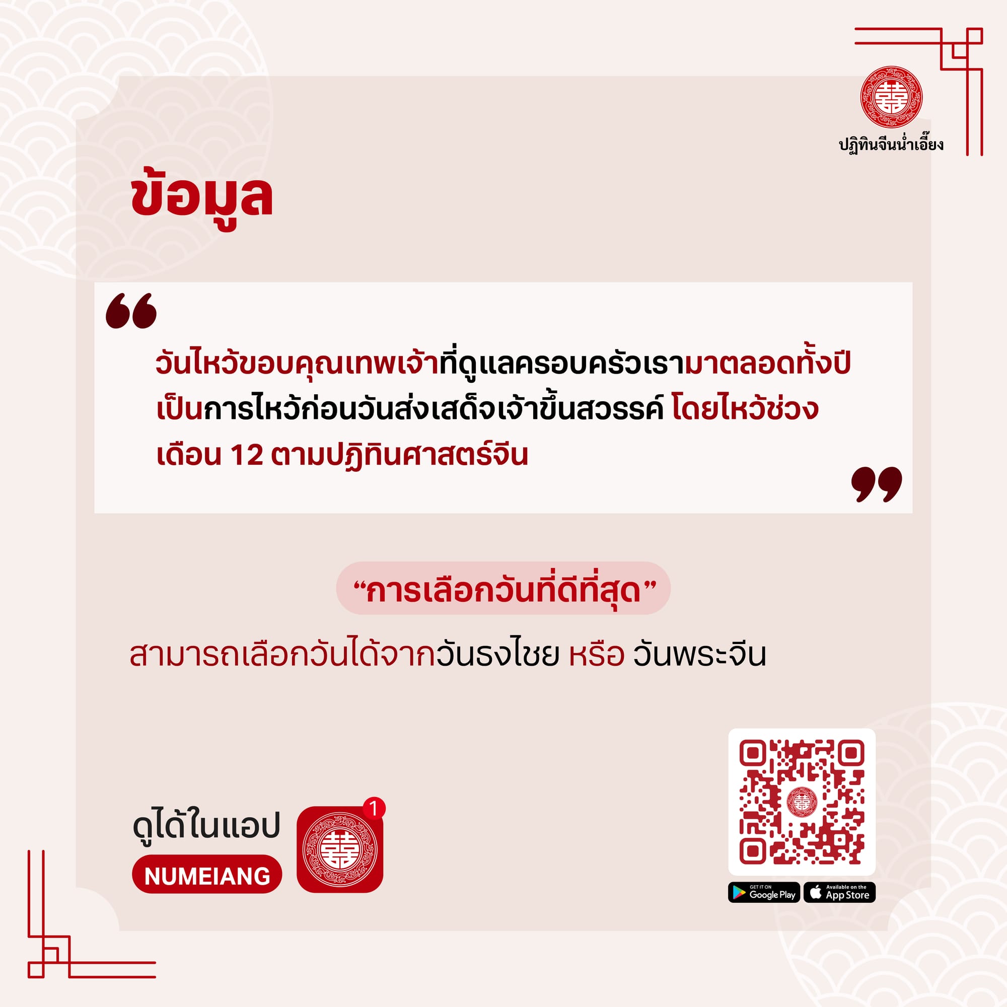 วันไหว้ขอบคุณเทพเจ้าที่ดูแลครอบครัวเรามาตลอดทั้งปี โดยไหว้ช่วงเดือน 12 ตามปฏิทินศาสตร์จีน โดยการไหว้ขอบคุณจะเลือกวันที่ดีที่สุดระหว่างวันที่ 11 มกราคม ถึง 2 กุมภาพันธ์ 2567