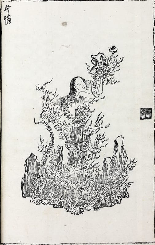 ตำนานที่เรียกว่า ซิ้งอ่วย (神文) ซึ่งกล่าวถึงหญิงนางหนึ่ง ที่มีนามว่า นึ่งออเนี่ย (女媧) มีท่อนบนเป็นคนท่อนล่างเป็นงู เมื่อนางสิ้นอายุไขจากไปแล้วกระทั่งเวลาผ่านพ้นไปนาน 3 ปี แต่ร่างกายกลับยังไม่เน่าเปื่อย ทำให้มีคนผ่าท้องนางดูว่าภายในนั้นมีสิ่งใดอยู่ เหตุใดร่างจึงยังไม่เน่า ทันทีที่ผ่าท้องออกก็มีมังกรสีเหลืองพุ่งออกมาจากท้องแล้วเหาะทะยานหายขึ้นไปบนฟ้า จึงทำให้เกิดความเชื่อว่า มังกร เป็นสัตว์เทพศักดิ์สิทธิ์ และได้รับการยกย่องให้เป็นเจ้าแห่งสัตว์ทั้งปวง