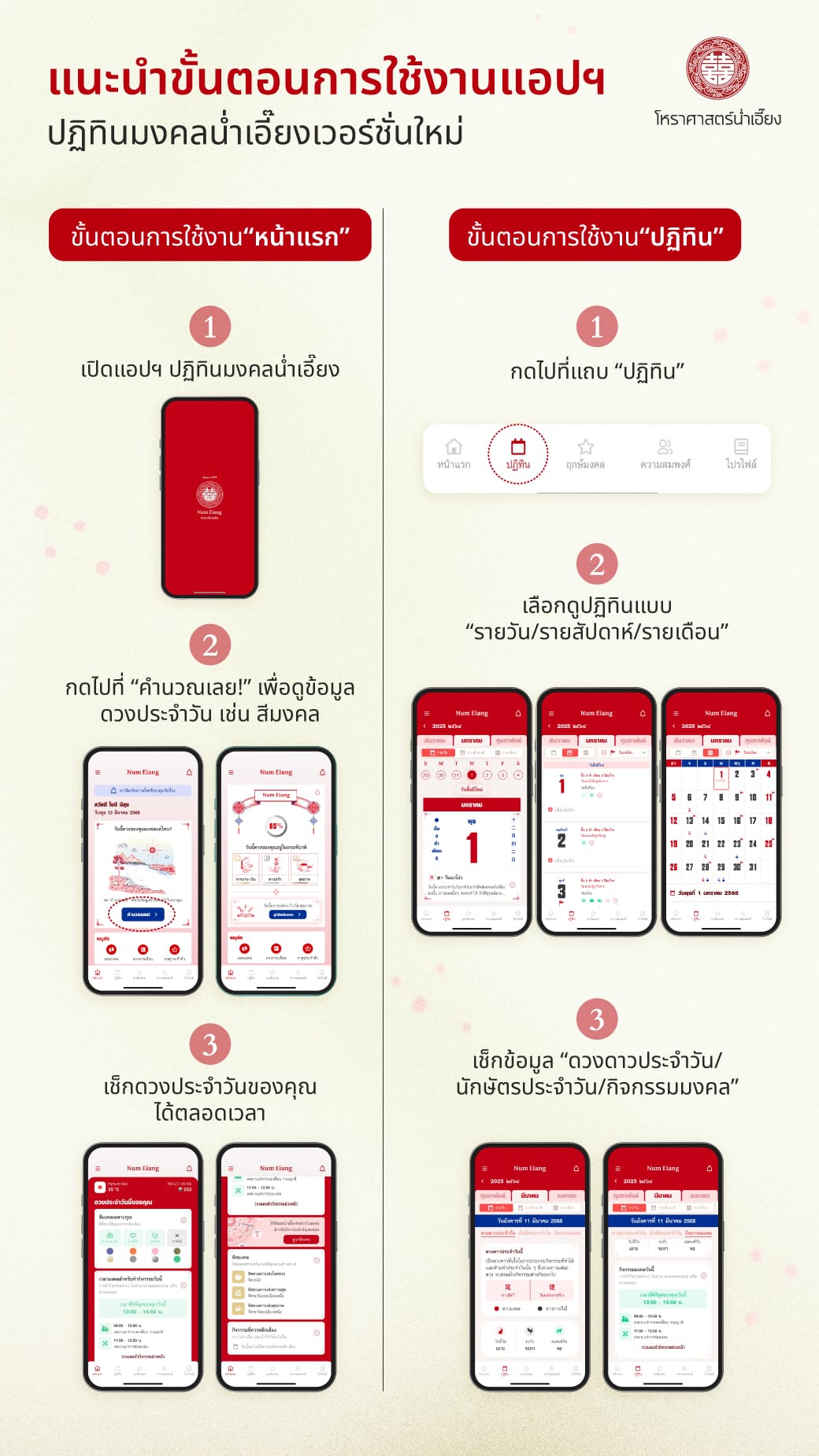 ฟีเจอร์ใหม่ "ระดับความมงคลประจำวัน" ในแอป น่ำเอี๊ยง คำนวณดวงของคุณจาก วัน เดือน ปี และเวลาเกิด ด้วยศาสตร์ ปาจื้อ (八字) ผสานพลังงานธาตุและดวงดาว แสดงผลเป็นเปอร์เซ็นต์ความมงคลเฉพาะบุคคล พร้อมแยกเป็น สุขภาพ การงาน-การเงิน และความรัก เนื่องจากวันเวลาเปลี่ยน พลังงานย่อมมีการเปลี่ยนแปลงไปทุกวันเช่นกัน หากวันใดมีระดับความมงคลน้อย แสดงว่าพลังงานประจำวันไม่เอื้ออำนวยมากนัก ก็สามารถเลือกเสริมดวงได้ตามคำแนะนำ เช่น เสริมดวงด้วยสีมงคล เลือกทำกิจกรรมในเวลาที่เหมาะสม การเลือกใช้สิ่งของต่างๆ ที่คำนวณจากดวงของคุณโดยเฉพาะ เพื่อให้การใช้ชีวิตประจำวันของคุณเป็นไปอย่างราบรื่น หากวันใดมีระดับความมงคลมาก แสดงว่าวันนี้เป็นวันมงคลสำหรับคุณ สามารถเลือกทำกิจกรรมสำคัญรวมถึงการตัดสินใจต่างๆ ได้อย่างเต็มที่ ทั้งนี้สามารถเสริมดวงตามคำแนะนำเพื่อส่งเสริมให้วันนี้ส่งผลดีมากที่สุด