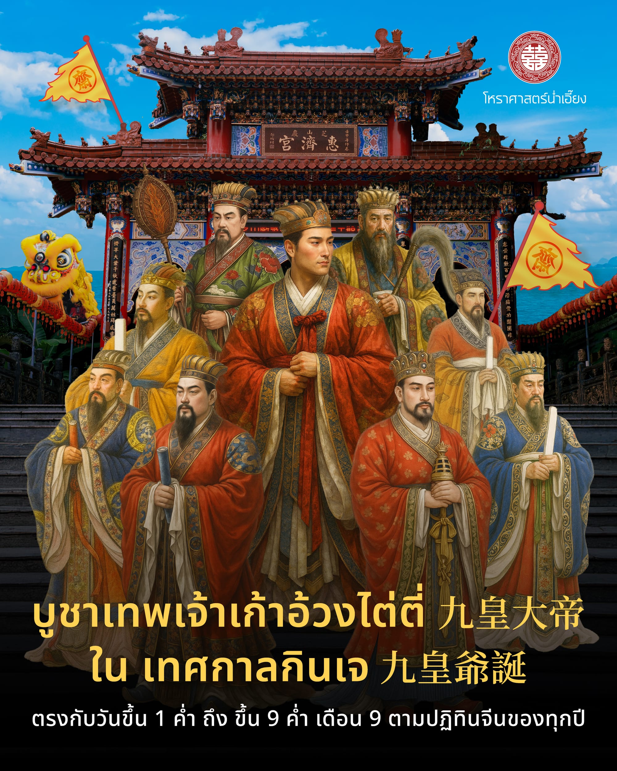 นอกจากการถือศีลกินผักแล้ว การกินเจ 9 วันยังเป็นช่วงเวลาของการบูชาดวงดาว 9 ดวง อันมีที่มาจากเทพเจ้าเก้าอ้วงไต่ตี่ (九皇 大帝) ในสำเนียงแต้จิ๋ว ซึ่งชาวจีนเชื่อว่าดาวแต่ละดวงจะส่งผลดีต่อชีวิตในด้านต่าง ๆ ดังนี้