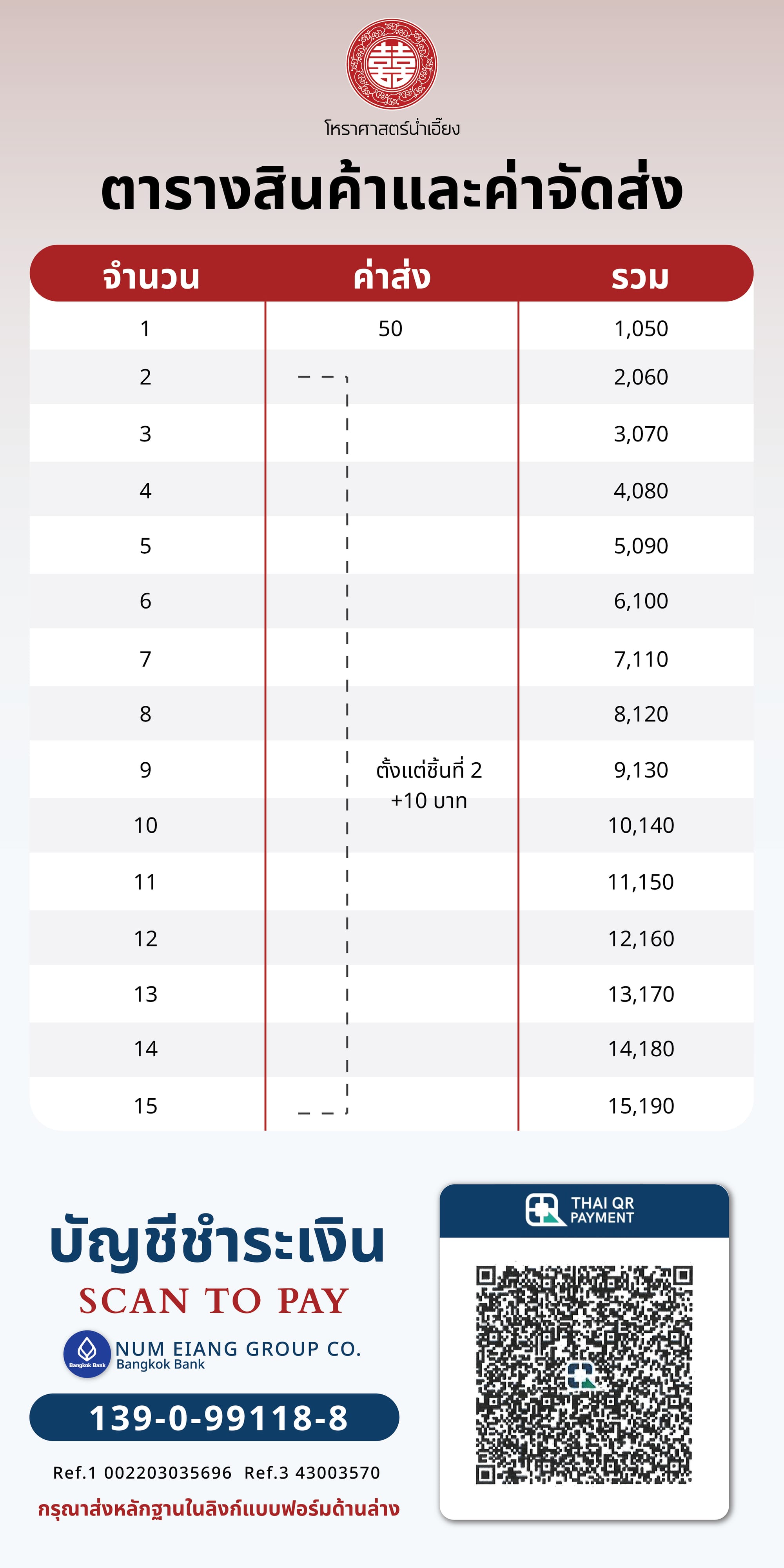 1. ค่าส่งชิ้นแรก 50 บาท ชิ้นต่อไป +10 (ดูตามตารางด้านล่าง)