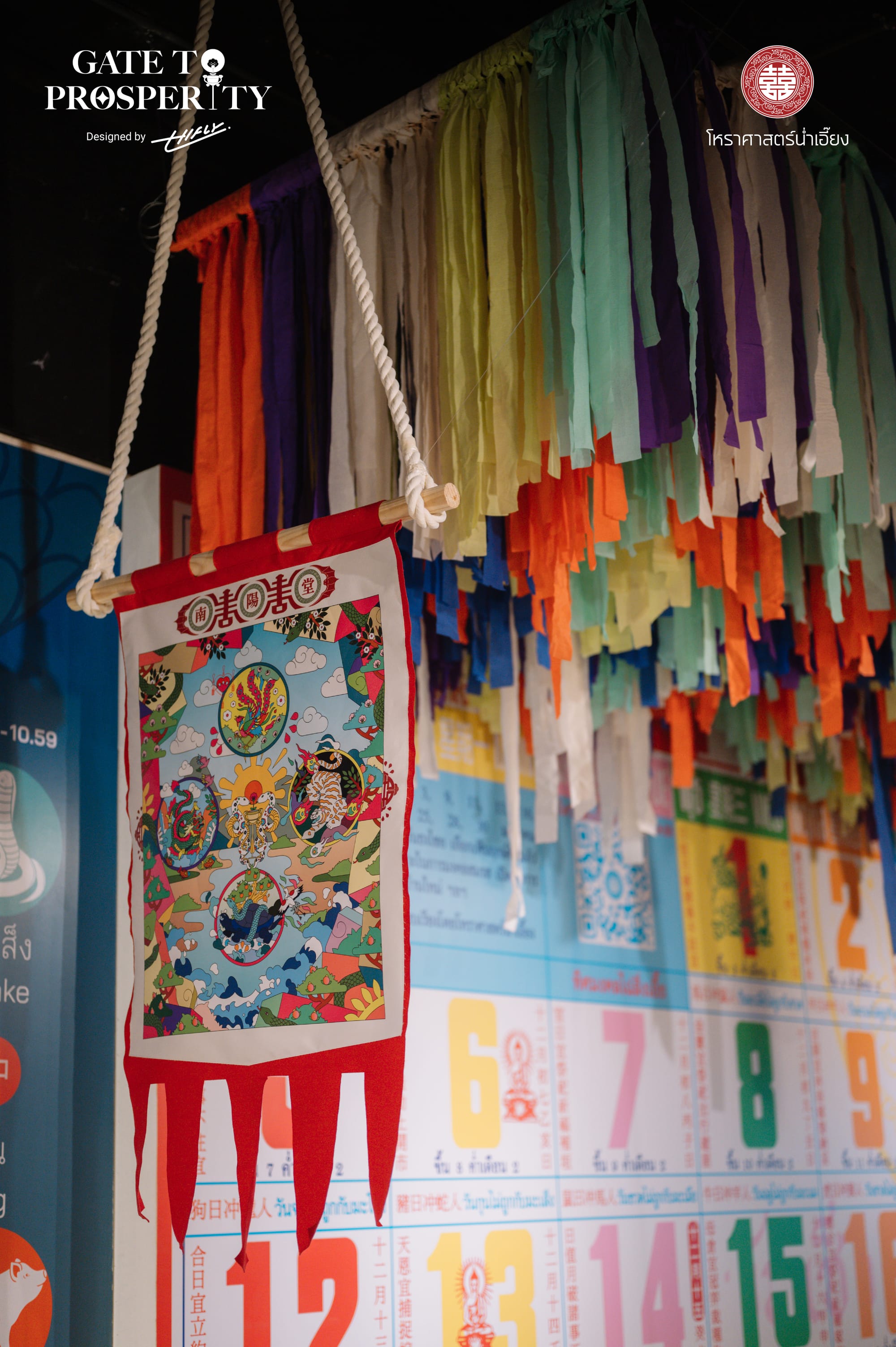 เชิญชวนร่วมกิจกรรม เดินลอด ธงมงคลขนาดใหญ่ ซึ่งเป็นสัญลักษณ์ของการรับพลังแห่งความโชคดีและความสำเร็จที่ประกอบด้วยสัญลักษณ์สัตว์เทพทั้งสี่
