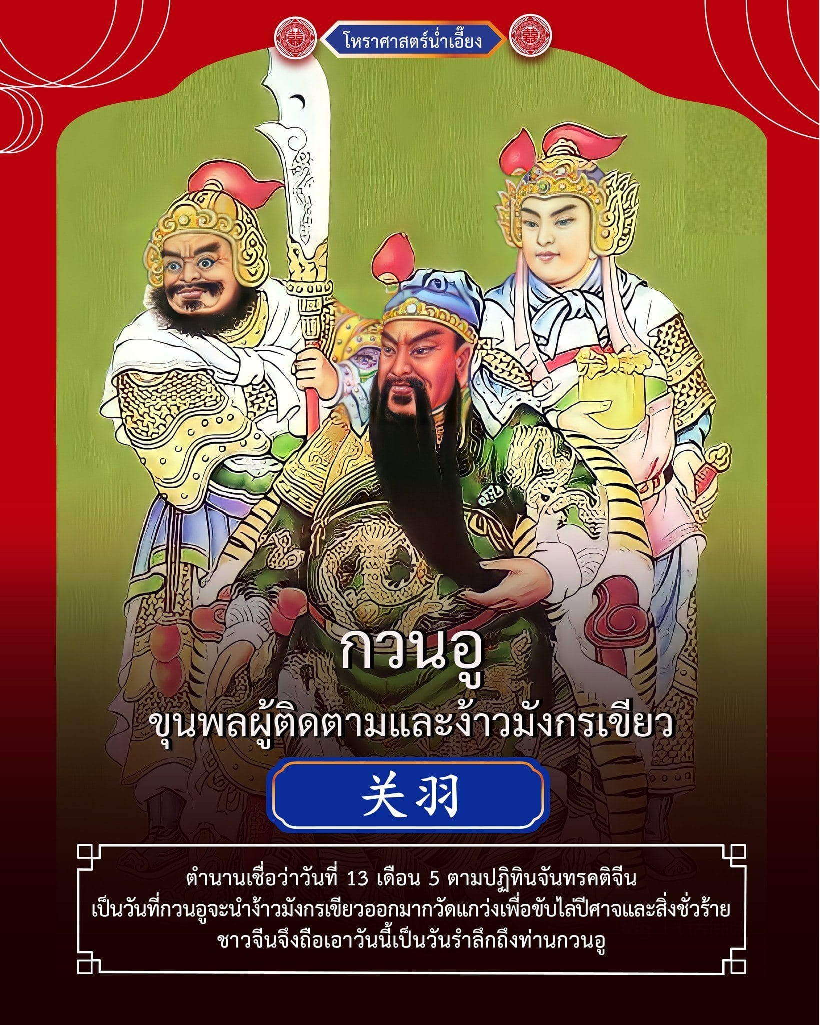 หากในวันนี้เกิดฝนตกลงมา จะถือเป็นมงคลอย่างยิ่ง เพราะเชื่อว่าเป็น “ฝนลับง้าว” ของเทพเจ้ากวนอู ที่ช่วยชำระล้างสิ่งไม่ดีให้ออกไปจากบ้านเรือน