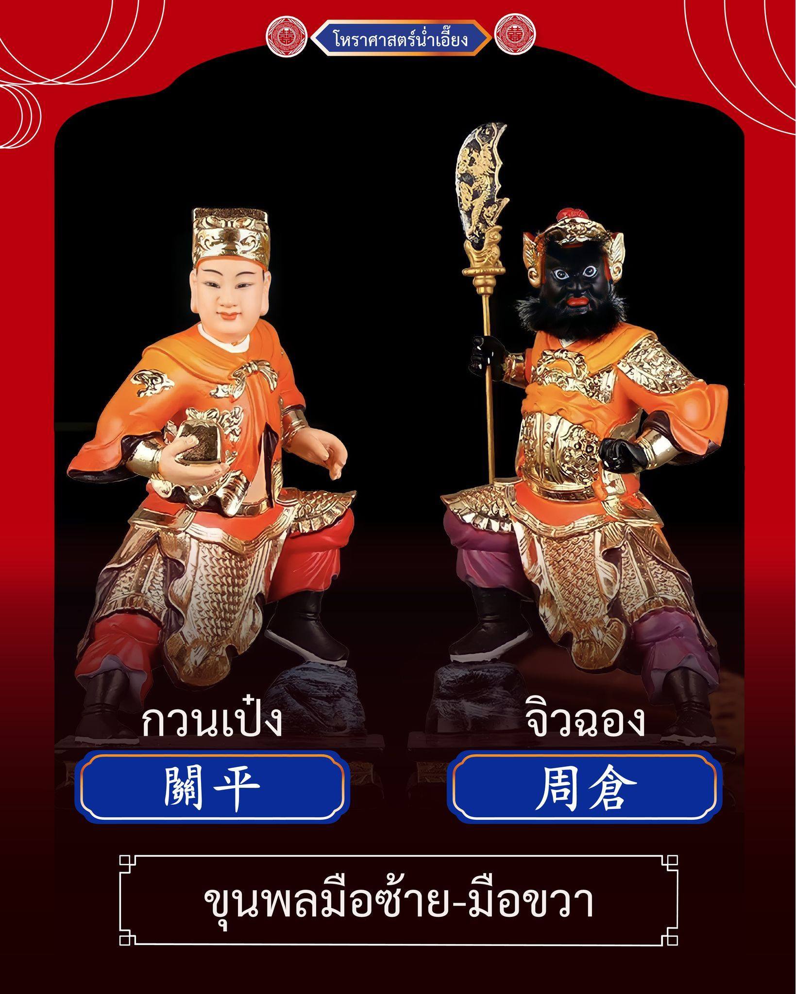 กวนเป๋งมักปรากฏเคียงข้างกับ “จิวฉอง” (周倉) ขุนพลผู้จงรักภักดีต่อกวนอูจนถึงชีวิต เขายอมฆ่าตัวตายตามเมื่อนายถูกประหาร ลักษณะของจิวฉองเป็นชายร่างใหญ่ หน้าดำเข้ม คิ้วหนา เคราดก และมักจะยืนอยู่ฝั่งขวาของกวนอู ทำหน้าที่ถือง้าวมังกรเขียว อาวุธประจำตัวของกวนอู
