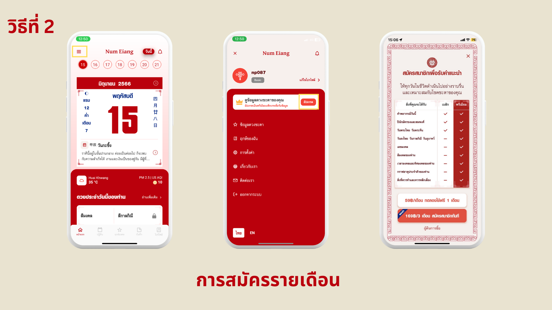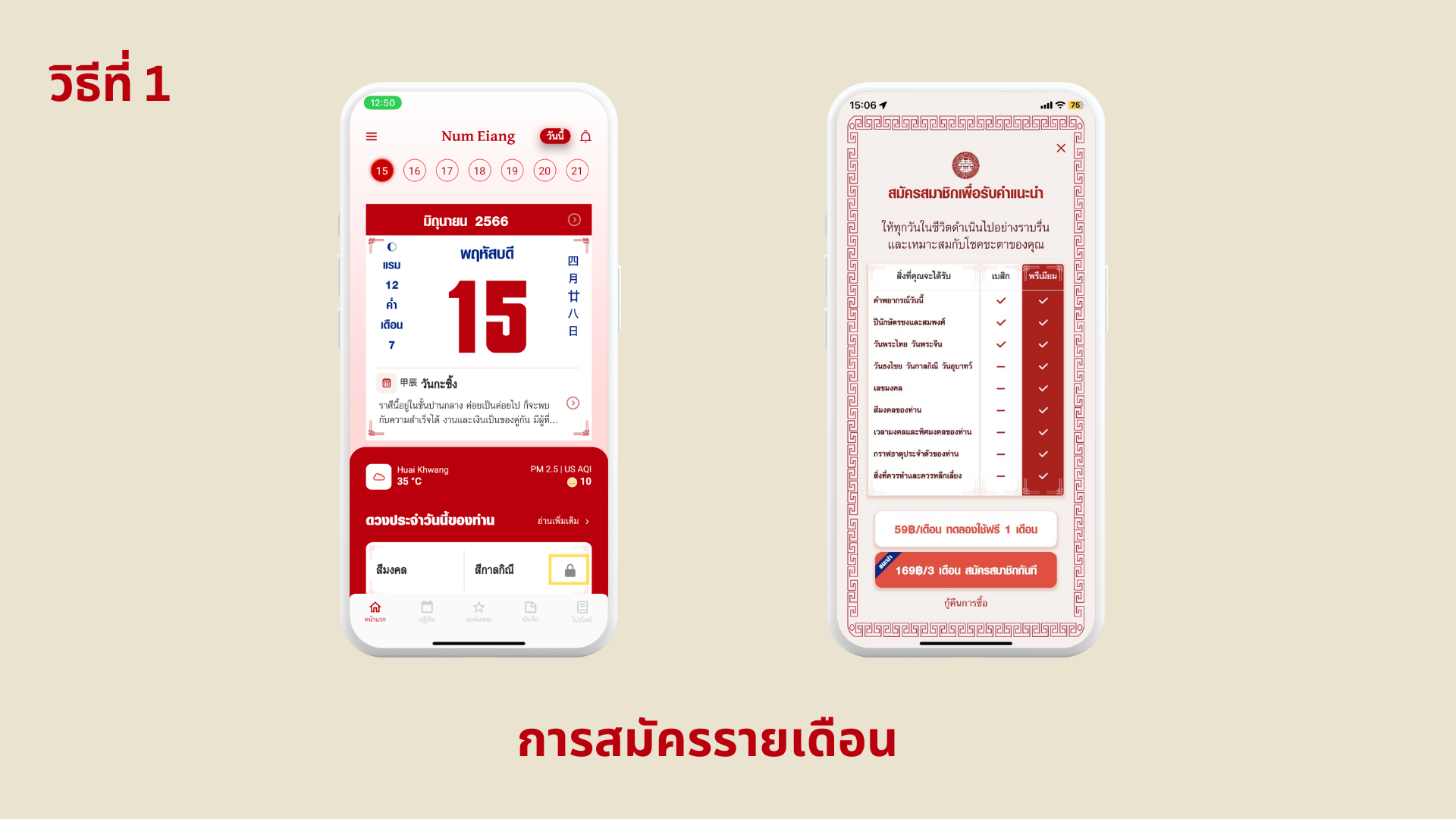 เปิดแอปพลิเคชัน > กดรูป ล็อคในหน้าแรกตรงสีมงคล > หน้าต่างรับสิทธิ์ทดลองใช้ฟรีหรือสมัครรายเดือนโชว์ขึ้น > สามารถเลือกแพ็กเกจที่ต้องการได้